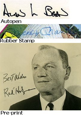 3. AUTOPENS, RUBBER STAMPS & PRE-PRINTS - These are various mechanically produced forms of reproductions of someone’s signature. Like Secretarial/Ghost-Signed items, these are commonly seen in autograph requests made via the mail, where the celebrity did not want to take the time to hand-sign the items and sent back reproductions of their signature instead. In both cases, many of these were done well before the recent